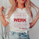 Trendy and funny parody of the classic "thank you, have a nice day" grocery bag features a cute retro typography design with "WERK" in bold red lettering repeated five times, and "have a nice day" beneath.