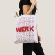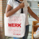 Our funny and trendy take on the classic "thank you, have a nice day" grocery bag features "WERK" five times in bright red block typography with "have a nice day" tucked at the bottom. Makes a fun and functional alternative to plastic grocery bags, with cute retro style and years of use!