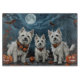 Unleash the spooky spirit with this eerie Halloween design featuring a pack of dogs under a dark, moonlit sky, surrounded by flying bats and glowing pumpkins. Perfect for those who love a touch of frightful fun with their furry friends!