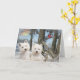 Greeting card of two White Westie dogs against weathered fence on winter day with red Cardinal overhead.
