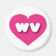 This magnet features a shapely and vibrant hot pink heart containing the bold, rounded, white lower case letters wv, a playful version of the abbreviation for West Virginia, the mountain state.