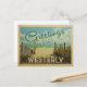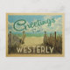 This Greetings From Westerly vintage postcard design features a sandy beach with a beautiful turquoise ocean water and above the sea, a blue sky with billowy white clouds. In vintage travels style.