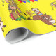 A fun cartoon bull rider and rodeo clown with rodeo arena flags on gift wrapping paper.