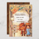 A fun and unique combination of watercolor and ink line illustrations featuring a cartoon cowboy and cowgirl standing next to each other wearing Stetson hats. He is tipping his hat to you and they are set in front of a wooden arch adorned with green foliage; a wanted poster and faux glowing string lights. A signpost next to them reads "save the date" and a single faux glowing lantern hangs from creepers growing on the arch. Personalize the templates and don't forget to delete the extra template on the back of the invite if it is not required.