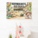 A watercolor graphic of a beautiful cowgirl with long flowing blonde hair wearing a Stetson cowboy hat holding the reigns of a white / gray colored horse. She is looking across a desert landscape filled with pretty cactus plants filled with pastel colored orange and yellow flowers. The words "bridal shower" is preceded by a text template for the bride's name and the word bridal appears in a faux cow hide filled with marquee lights. If you are hosting a Southern style western theme bridal shower then this wall hanging is ideal.
