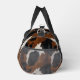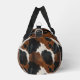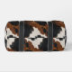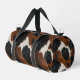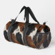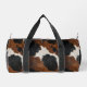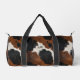 For cowboys, cowgirls, cattle hands, ranchers and lovers of all things western, this unique duffel bag has a brown black and white tri-color cowhide pattern with a furry look. A text template is included to personalize with your monogram initials. Take it to the gym, school, the office, and getaways. It has the perfect casual appeal to go with blue jeans, cowboy boots and a ten cowboy hat. Note: This item uses a faux cowhide digital print to cover the surface of the duffel bag. There is no actual fur on the product.