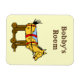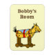 An editable magnet with western letters and vintage art of a toy horse with brown spots on wheels, restored from a childrens storybook.