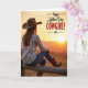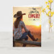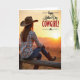Designed with a calm western landscape under a glowing dawn-or-dusk sky, this card centers on a lone figure seen from behind, perched on a weathered wooden fence as if pausing for a quiet, affectionate thought ❤️. They wear a wide-brim hat, a plaid shirt in warm orange, blue, and brown tones, dark denim pants, and sturdy boots, giving the scene a grounded, frontier feel. The low sun flares in amber and gold behind softly rolling hills, wrapping the horizon in light that gently outlines the person and brings out the rough grain of the fence. A warm halo catches in their hair, adding a tender softness to the solitude, like someone holding a loved one close in their mind. In the upper right, the words “happy Mother’s Day COWGIRL!” appear in decorative lettering, set clearly against the sky so it reads at a glance 🌼. The text is placed high and slightly angled, with a light-toned fill and darker edging that helps it stand out without overpowering the scenery. The background fades from deep, dusky tones at the top into bright gold near the sun, while the hills remain muted and shadowed to keep the focus on the figure and the message. The fence rails run horizontally across the lower half, with the figure’s boots resting near the top rail and the sun sitting just above the hill line.