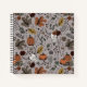 This elegant autumn notebook features hand-drawn illustrations in black ink, featuring a western Fall Harvest scene with cow skulls, roses, pumpkins, autumn leaves, branches and berries, all in an elegant fall color scheme. Taupe gray background.
