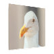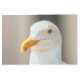 A close-up photograph captures the head and beak of a western gull. The bird's white feathers are soft and fluffy, contrasting with its bright yellow beak and a hint of red at the tip. Its dark eye, with a ring of orange around the pupil, stares directly at the viewer. The background is a soft, out-of-focus blur of beige and brown tones, creating a sense of depth and highlighting the bird's features.