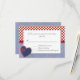 Fun western theme wedding response RSVP card done in red, white, and blue graphics. The top of the card is done in a red and white checked pattern, with a blue denim look, on the bottom half and covering the back of the card. Graphics of a blue and red denim applique heart decorates the bottom left corner. All text is customizable and ready to personalize for your western theme wedding. Matching wedding products available.