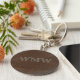 This personalized keychain features a light brown monogram in Western-style font on a brown faux leather background.