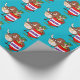 Cartoon rodeo clown inside of a barrel and a bull behind him gift wrapping paper.