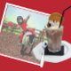 Western Rodeo Cowboy Cowgirl Mutton Busting with truck ad trailer in the background and a cowboy by the fencing watching