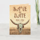 Rusic western country vintage beige brown antique rodeo cowboy style scenery background wedding save the date folded cards. Farmhouse bull cow skull invitations. Old wild west, unique, cool, trendy farm animal. Image copyright Marg Seregelyi Photography.