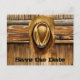 Western Save the Date Wedding Cards (postcards) - features an elegant, rustic door with vivid wood grain detail. A large brown - suede cowboy hat hangs on the door. Below a western theme font is used for the demo save the date text. The back of the save the dates feature the same door with aged, old paper hanging from it by a red thumbtack. You can change the font, sizing, colors or even the wording to what ever you prefer. You can also move around the text boxes or add more if you would like. Use the orange customize button below the postcard demo. If you are satisfied with the font color, style and sizing, just use the personalize feature to the right of the demo to get started. If you love the design, be sure to check out "natureprints" or "store" above to find matching wedding invitations, thank you cards, RSVP cards and more.
