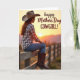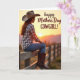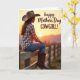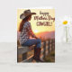 Designed with a solitary woman sitting sideways on a weathered wooden fence, the scene shows her looking toward the horizon as the sun sinks low behind her. The sky glows in layered oranges, yellows, and deep amber, and the distant land fades into a soft twilight blur that frames her quiet, steady pose. She wears a checked flannel shirt and fitted denim trousers, and her tall brown boots feature small stitched details that add a gentle, cared-for touch. A wide-brim hat shapes her silhouette, while her long auburn hair catches the light like a warm halo, giving the moment a tender, companionable feel ❤️. Near the top, the phrase “Happy Mother’s Day” appears in a dark, flowing style, with “Cowgirl!” set just below it in a matching tone, standing out against the bright sky. The rustic fence rails run horizontally across the lower half, guiding the eye toward her relaxed posture and the open space beyond. A few soft highlights along the fence posts and the edges of her hat glow like tiny sparks in the sunset 🌼.