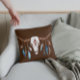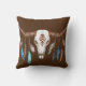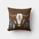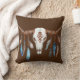 Western style watercolor illustration of steer / cow skull decorated with hanging feathers tied with rawhide and beads