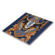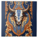 Western Tooled Leather Look Cow Head and Damask Pattern decorative ceramic tile. A majestic bull head adorned with intricate blue and gold filigree patterns reminiscent of elegant damask. The skull is a work of artistry, its bone-white surface embellished with a bold blue damask design that is echoed in the surrounding ornamental frame. The composition has a deep navy background, where golden baroque scroll-work creates a luxurious border. Detailed craftsmanship merges Western and European decorative traditions, transforming a symbol of natural strength into an emblem of refined sophistication. This tile would look great in a western themed kitchen or man cave and makes a good gift for anyone who loves the old wild west.