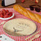 Western wedding rustic bull cow skull brown beige vintage antique style paper dinner reception dinner paper plates. Old country farmhouse style scenery background design decor. Wild west cowboy inspired. Four skulls in a pattern with custom name and date script. Trendy, cool, farm animal party supplies. Image copyright Marg Seregelyi Photography.