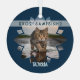 Stylish modern holiday ornament with cat name featured in fun typography in white on a blue background, over your cutest cat photograph. All framed in a pretty flower shape. Christmas 2025 on the face of the classy ornament.
