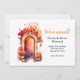 This watercolor moving home announcement features a rustic door surrounded by leaves and pumpkins. This is perfect for autumn fall.