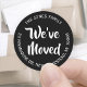 Add an elegant finishing touch to change of address cards, new address announcements, and other correspondence with these We've Moved / I've Moved round stickers. All text can be customized. Black and white design features stylish handwriting script calligraphy and personalized name & address in a circle These labels are a chic modern way to introduce friends and family to your new home. Simple minimalist design adds sophisticated style to housewarming party invitations, we moved / moving announcements, holiday cards to friends and family, wedding, bridal shower or graduation thank you notes, etc.