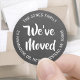 Add an elegant finishing touch to change of address cards, new address announcements and other correspondence with these We've Moved / I've Moved round stickers. All text can be customized. Black and white design features stylish handwriting script calligraphy, chalkboard background, and personalized name & address in a circle. These labels are a chic modern way to introduce friends and family to your new home. Simple minimalist design adds sophisticated style to housewarming party invitations, we moved / moving announcements, holiday cards to friends and family, wedding, bridal shower or graduation thank you notes, etc.