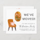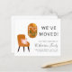 Budget-friendly boho chic new home and change of address moving announcement featuring abstract illustrations of a terracotta chair with a pink floral pillow adjacent to a window looking out to a terracotta landscape of pink flowers and a sun. On the front, personalize with your family name, the "We've Moved" text and your new address. On the reverse side you can personalize your announcement in more detail and include a telephone number and email if desired.