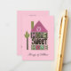 This colorful moving announcement features whimsical pink and green Home Sweet Home text that is playful and cute. It is possible to change the color of the background. A fun way to let friends and family know that you have moved to a new home!