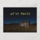 Change of address postcard shows a small, old house on a dark night, with a spooky figure at an orange window. The yellow text reads "We've Moved" above the haunted house.