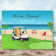 This fun golf moving design features a golf cart with moving boxes parked next to a putting green and in the distance is a beach with beach chairs and umbrella. It's a unique moving announcement for golfers and beach lovers.