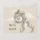 Original pencil drawing of an abandoned snail house. The snail house has two closed windows and closed doors. It also has a roof and a lovely path leading to it. Behind the house are white clouds. On the left bottom corner of the Postcard is customizable text saying: "We've moved".