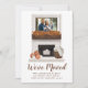 Announce your move and new address to friends and family with our unique Rustic Fall Farmhouse Fireplace moving announcement! The fall moving announcement features your horizontal family photo in a dark wooden frame mounted on an off-white brick fireplace. The fireplace mantle is decorated with a garland of watercolor autumn leaves with white candles, white and orange pumpkins, and other fall decor located on the hearth. Personalize the family photo moving announcement with your name, address, and other text. The back provides additional space for text and images. The moving announcement card is perfect for fall and Thanksgiving.