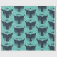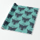 Gift wrap with a badge style graphic pattern features whale tail silhouette with mountain outline on light aqua background