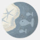 A fun scene featuring some cartoon whales in a blue ocean, starfish too!