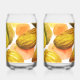 The design on these can glasses is watercolors of full and halved pickles with orange splatter, the set will make colorful decor in the home on those hot summer days.