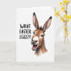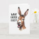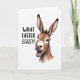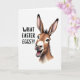 This card features a digital illustration of an animal-like character’s expressive head, shown in warm brown tones with creamy highlights against a plain white background. Long, slender ears rise straight up with darker tips, giving the character an alert, slightly teasing look, like it’s leaning in to share a joke with a friend. The face is shaded with soft texture, and wide, dark eyes with long lashes glance outward in a way that feels flirty and amused 🐰. An open mouth with a pink interior and neat white teeth adds a surprised, “caught in the act” expression that reads as friendly mischief. To the left of the character, large hand-drawn letters ask “WHAT EASTER EGGS?!” in dark ink, stacked to fill the empty space without crowding the face. The strong contrast between the dark text and the white background keeps the layout easy to read, while the character’s warm coloring stays the main focus 🌷. The ears are angled slightly apart, and the question sits beside the cheek, aligned mid-height with the eyes.