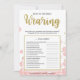 This modern floral "What is the Bride Wearing" bridal shower game features a pink floral background with golden glitter splashes. The text is written in a mix of a playful calligraphy font and a modern sans font, this card is personalized with the Bride-to-be name and the Bridal Shower date.