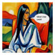 A woman in a white and blue dress sits on an orange chair within a landscape of vibrant hills and a bright sun, wondering 'What's that smell!'