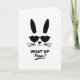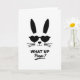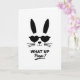 This card features a simple black rabbit face centered on a white background 🐰, with tall upright ears framing a smooth, rounded head. Heart-shaped sunglasses sit where the eyes would be, giving the bunny a flirty, friendly look as if it’s sharing a private joke with someone close 🐇. A small triangle nose, a curved smile, and thin whisker lines keep the expression light and inviting. Under the face, the words “WHAT UP” appear in thick, all-caps lettering in black, placed on a straight line and easy to read. Just below that, “Peeps ?” is written in a looser, flowing style in black, adding a casual, chatty feel. The sharp black-on-white contrast keeps everything crisp and graphic, while the heart lenses add a gentle romantic touch without changing the minimal look. The layout stays centered with generous white space around the bunny and the stacked text, and the sunglasses are drawn as two solid black hearts connected across the nose area.