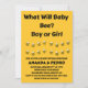 Beautifully designed 'What Will Baby Bee?' gender reveal party invitation. This invitation sets the tone for a memorable gender reveal where loved ones and friends gather to unveil the exciting news of your baby's gender. Feel free to customize/personalize this invitation to your liking. Enjoy your gender reveal!