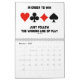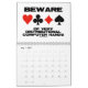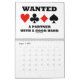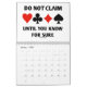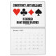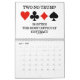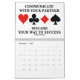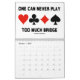 Showcase your wry bridge / duplicate bridge attitude throughout 2014 with this bridge calendar featuring 13 bridge sayings -- one for each month and a bonus design on the back of the calendar which expresses "What You Hear At The Bridge Table".