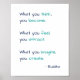 "What you think, you become. What you feel, you attract. What you imagine, you create." True wisdom by Gautam Buddha - a quote on life's truth about you, a quote to help you understand you & your life, better; a quote on your reality. A great poster for your walls, room, office, den, dorm room. Makes a great gift for friends & family, for graduation, birthday, christmas, holidays, and more.