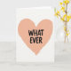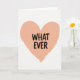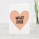 This greeting card features a large heart painted in a soft peachy pink right in the center. The heart sits on a plain white background, and you can see uneven edges and brush marks that make it feel relaxed and real. Inside the heart, the words “WHAT EVER” appear in black letters that look hand-drawn, with slightly uneven lines. The text is centered within the heart and stands out clearly against the light color. Together, the heart and the cheeky phrase give the card a funny, laid-back take on love that still feels affectionate 💘. It’s a nice pick for someone you care about who likes a little humor with their romance ❤️.
