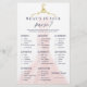 Fun & stylish what's in your purse bridal shower game card. Fun game to play at your bridal shower party. Elegant blush pink shimming dress with gold vintage hanger displayed in the background. Design with points ranging from 1 point items all the way up to 100 point items. The game card can be customized with your own point system as well as the item lists.
