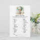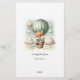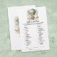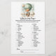 Adventure themed, "What's In Your Purse", baby shower game card with an adorable fox holding a teddy bear riding in a green hot air balloon. The watercolor green sky has white clouds with surrounding gold stars. Templates on back.