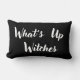 Cute black and white pillow with typography. Text reads: What's Up Witches. This festive and fun doormat is prefect for October and Halloween. Mat is black and typography is white script.