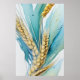 This watercolor print features a detailed stalk of wheat on a teal blue-green watercolor highlighted background. This unframed print is available in various sizes to fit standard frames.