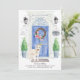Announce your new address with our stylish announcement featuring a Wheaten Terrier, blue front door, welcome mat, slate sign, topiaries and a floral wreath set on a gray brick background.